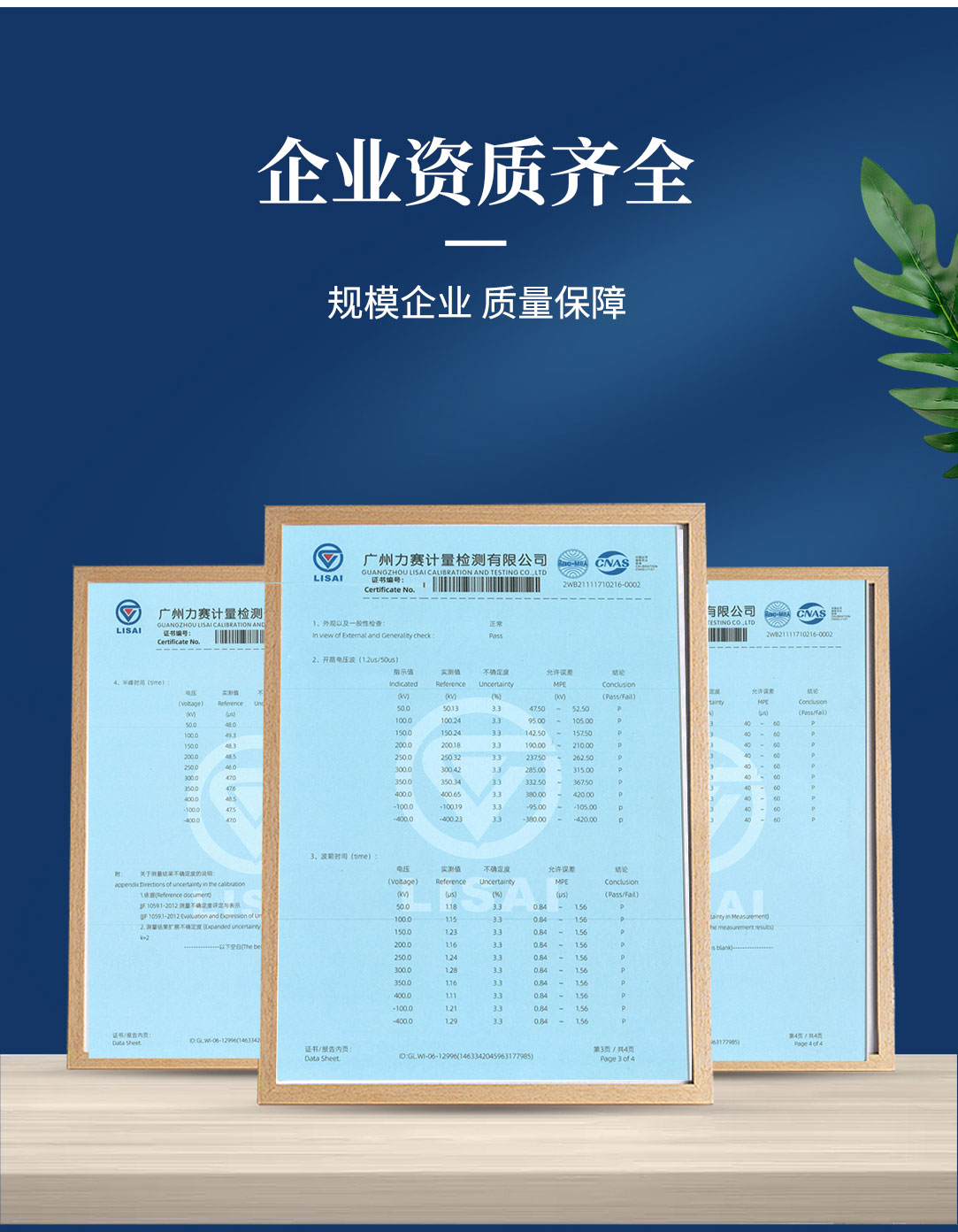 波頭時間:1.2±30%μs,波尾時間:50±20%μs,過沖:小于5%,效率:不低于90%。±1.2/50μs標準雷電沖擊電壓全波,效率大于90%。