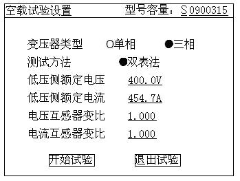2)在變壓器綜合測試儀主界面中選擇空載試驗,則顯示空載試驗設置界面如下圖: