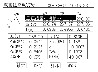 左上側為試驗電壓、電流的向量圖,如果接線錯誤,該頁面提示“接線錯誤,請關機檢查”;通過調壓器緩慢增加試驗電壓,當Uo(V)等于空載試驗的額定電壓時,停止升壓。移動光標到“鎖定”按鈕,長按OK鍵將出現(xiàn)圖9正在測量的提示,此時保持調壓器不動,當圖9中的正在測量的提示消息消失后,當前測試結果已經被鎖定,然后“鎖定”按鈕變?yōu)椤爸販y”按鈕,此時請迅速操作調壓器降壓至零位。