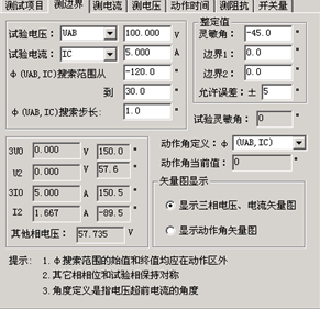 微機繼電保護測試儀的測邊界作者:合眾電氣發布時間:2021-08-16瀏覽量:3775 次字體顯示:【大】【中】【小】 微機繼電保護測試儀的測邊界。 測邊界 自動測試出方向性保護的兩個動作邊界,并且自動計算出最大靈敏角。在“顯示動作角矢量圖”的顯示方式下,從主界面右側的圖中可以很直觀地觀察到兩條邊界線和最大靈敏線。上一篇: 微機繼電保護測試儀試驗參量下一篇: 微機繼電保護測試儀測試項目的界面說明