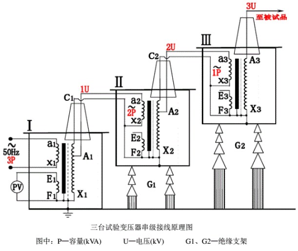 在第一級和第二級的試驗變壓器中都有一個勵磁繞組A1C1和A2C2。低壓電源加在試驗變壓器Ⅰ的初級繞組a1x1,上,單臺試驗變壓器Ⅰ、Ⅱ、Ⅲ的輸出電壓都是U。勵磁繞組A1C1 給第二級試驗變壓器Ⅱ的初級繞組供電;第二級試驗變壓器Ⅱ的勵磁繞組A2C2給第三級試驗變壓器I的初級繞組供電。試驗變壓器Ⅰ的箱體接地,試驗變壓器Ⅱ、Ⅲ的箱體對地絕緣,分別處在對地為1U 和2U的高電位上,。這樣第一級、第二級、第三級試驗變壓器對地的額定輸出電壓分別為1U、2U、3U;其額定容量分別為3P、2P、1P。
