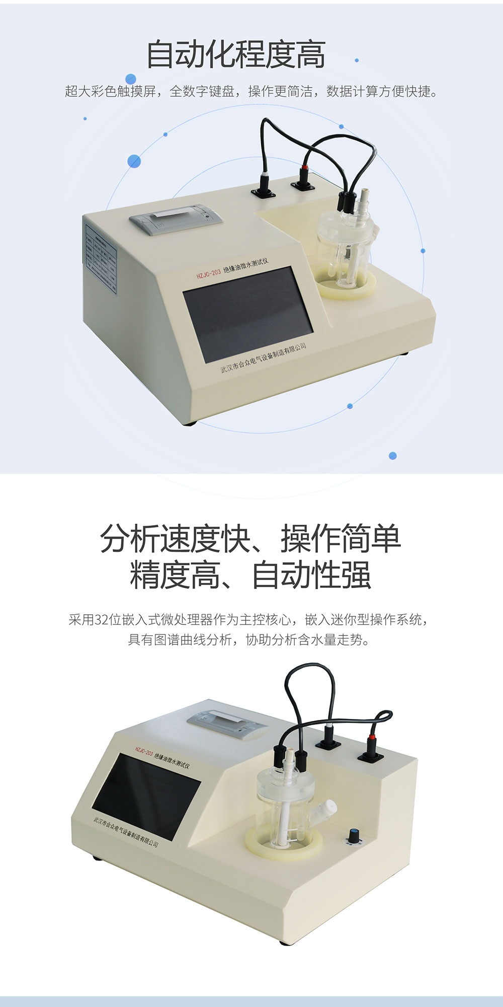 絕緣油微水測(cè)試儀,采用卡爾—費(fèi)休庫(kù)倫滴定法,采用了先進(jìn)的自動(dòng)控制電路,32位嵌入式微處理器作為主控核心,嵌入迷你型操作系統(tǒng)。對(duì)不同物質(zhì)進(jìn)行微量水分的測(cè)定。執(zhí)行標(biāo)準(zhǔn):GB/T 7600-2014。